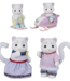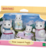 Deze set bevat moeder, vader, baby’s in bijpassende rompertjes en accessoires. De sneeuwluipaardfamilie heeft fluffy, witte vachten en lange staarten. Het hoofd, de armen en de benen van de ouders zijn beweegbaar. De figuren zijn gekleed in lichtgekleurde, luipaardprintkleding die uitgetrokken en weer aangetrokken kan worden. De huid van de figuren is zacht als fluweel. De baby’s kunnen op de baby-sneeuwscooter rijden en skiën. De lange staarten van de moeder en vader kunnen zich om de baby’s wikkelen en hen vasthouden. Het patroon achter hun oren ziet eruit als bloemblaadjes.