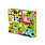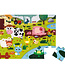 Reuzenpuzzel van 20 stukjes van stevig karton, met 7 beklede stukjes (vacht van koe, schaap, nepstaart van konijn, varken, eend, hanenkam, kikker). Afbeelding in levendige kleuren met de boerderij als thema. Poster meegeleverd.