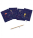Een boekje met 4 kraskaarten met wilde dieren in een uitbundige natuur. Om de afbeeldingen te ontdekken, gaan de kinderen met het houten pennetje over de tekening van de artiest heen en krassen ze de bovenste laag weg. Beetje bij beetje verschijnen de tekeningen als bij toverslag!