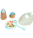 Tijd om te eten! Een doos met tafelset die alle essentiële accessoires bevat voor de maaltijd van kleine en grote babys: een bordje met verschillende compartimenten, een lepel, een tuitbeker, een zuigfles en een slabbetje. Vandaag op het menu: doperwtjes en worteltjes, stukjes kaas en lekkere aardbeien.