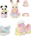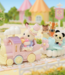Een set attracties met schattige elementen, inclusief de Chocolade Konijn baby en de Pookie Panda baby. De rook van de stoomtrein beweegt op en neer terwijl de trein rijdt. Het vliegtuig zwaait naar links en rechts. De baby's dragen schattige outfits die bij elke attractie passen.