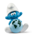 De Duurzaamheidsmurf zit al peinzend op de grond en streelt de grote wereldbal op z'n schoot. Hij is..